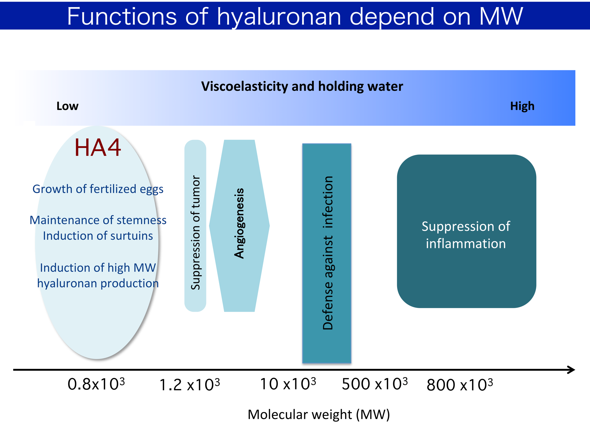 Hyaluronan is now known to many people. However, its application is still very limited. At the forefront of hyaluronan research, it has been reported that naked mole rats showing longevity have ultra-high molecular weight hyaluronan to suppress cancer [8]. It is thought to be tips for longevity and cancer control. On the other hand, we found that HA4 small hyaluronan at the opposite end, leads to the growth of fertilized eggs, i.e., totipotent stem cells that are at the highest level of stem cells. HA4 will also contribute to infertility treatment and regenerative medicine by inducing longevity genes, sirtuins.